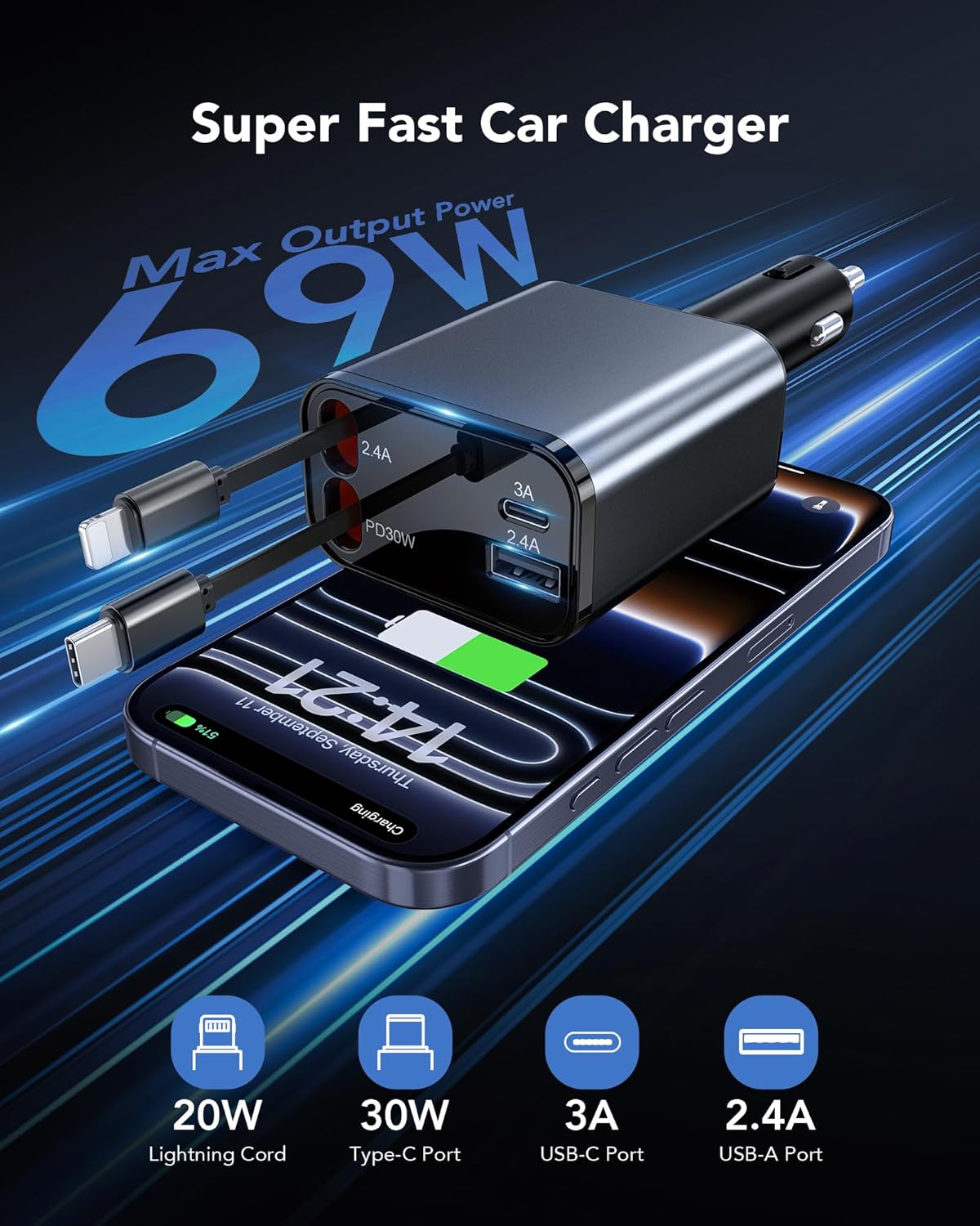 72W Retractable Car Charger - Ultra-Compact, 75% Less Space