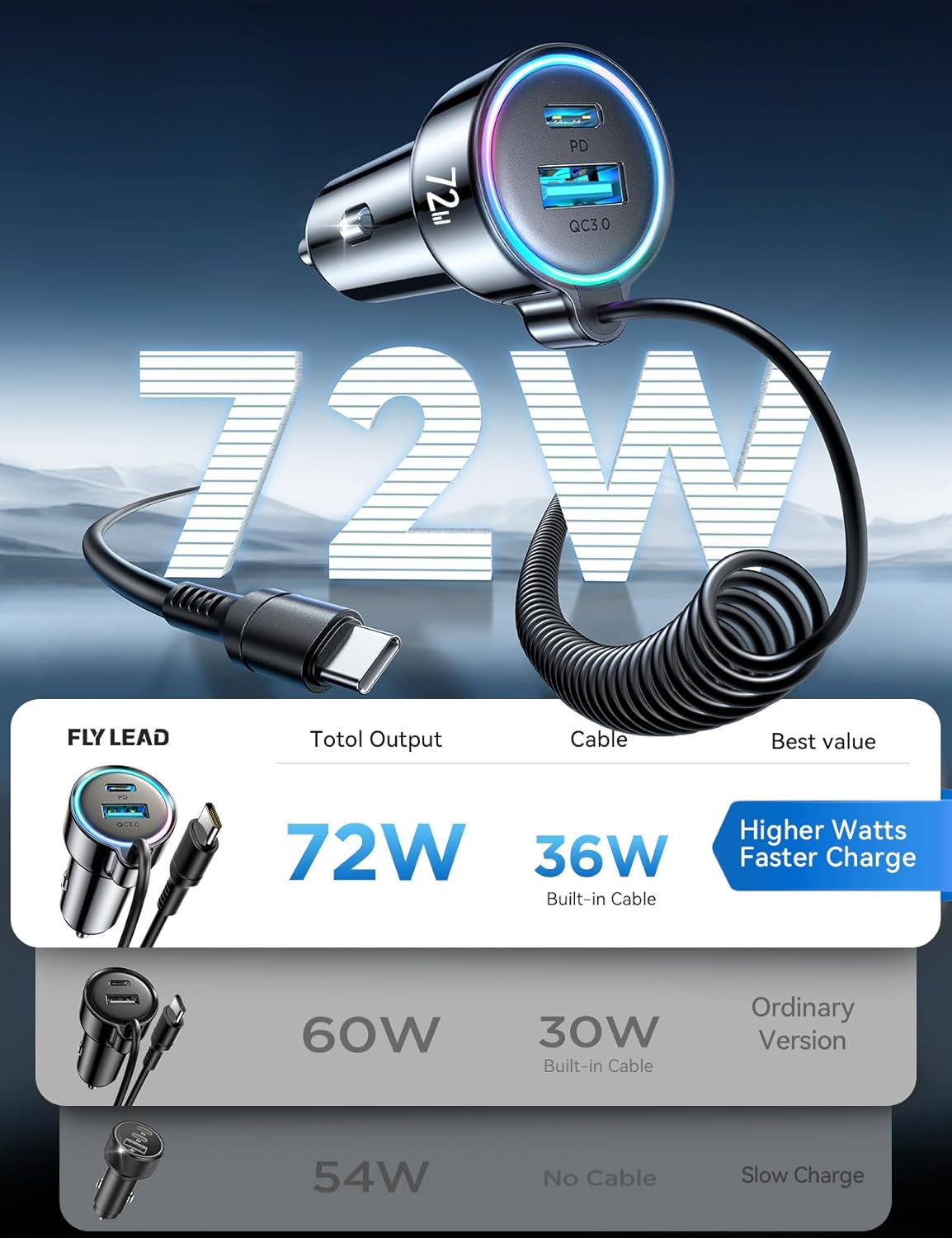 FLYLEAD UPGRADED 72W SUPER FAST CAR CHARGER W. 36W USB C COILED CABLE
